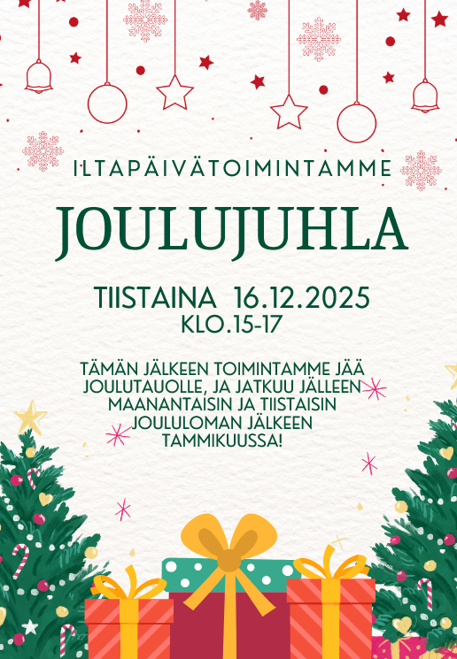 HUOM! Vietämme joulujuhlaa tiistaina 16.12.2025 klo.15-17, jonka jälkeen jäämme joulutauolle.